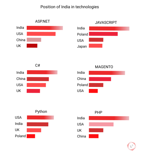 Also, the latest technologies and frameworks are more widely used in India than in any other country in the world. India ranks first globally by the number of Angular.js, ASP.NET, Node.js,Vue.js, Ruby on rails, flutter, and PHP developers.